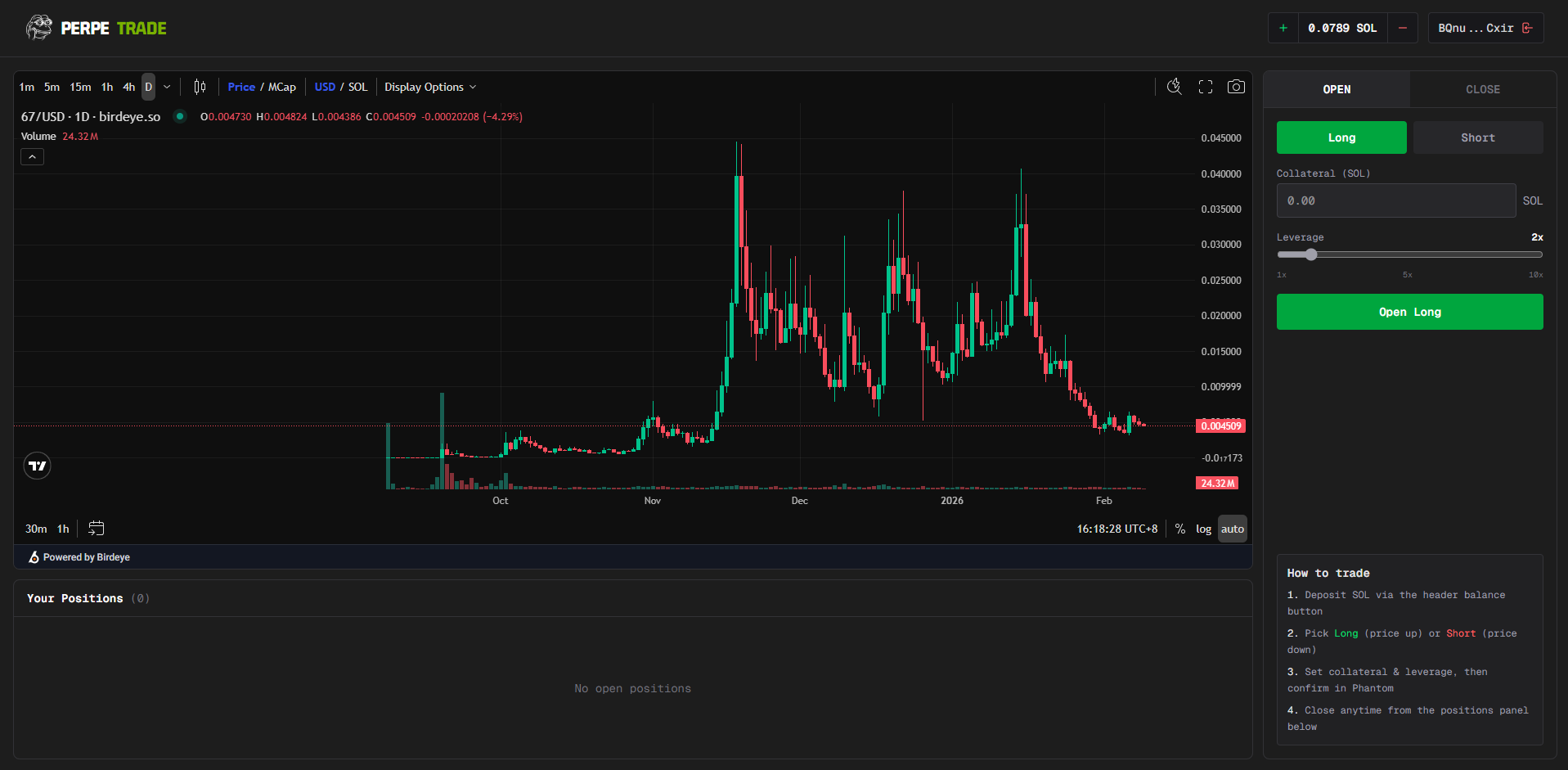 Up to 10x leverage on any memecoin. Open long or short in one click. Fully on-chain.